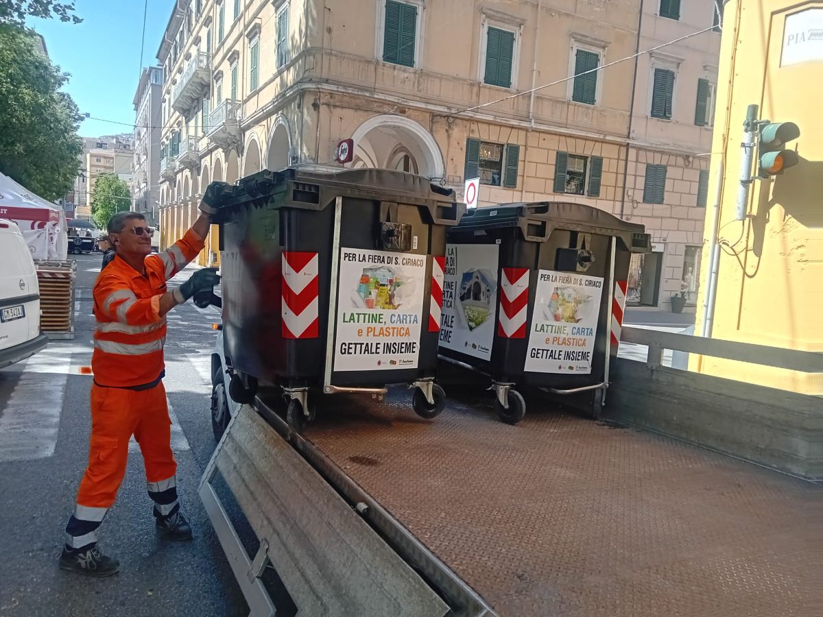 AnconAmbiente ha avviato le operazioni di posizionamento dei contenitori per la raccolta differenziata in vista della Fiera di San Ciriaco, in programma dal 1 al 4 maggio 2026 nel cuore della città. L’intervento consentirà di rendere il sistema pienamente operativo già all’avvio dell’evento, garantendo l’intercettazione immediata dei flussi di rifiuto. Il sistema si traduce in 125 contenitori complessivi, di cui 80 da 1.100 litri per plastica, carta e lattine (debitamente graficizzati) e 45 da 240 litri per la frazione organica. Nei quattro giorni della manifestazione saranno impegnati in tutto 30 operatori e 9 mezzi, con presidio costante del servizio a supporto del decoro urbano e della pulizia dell’intero percorso fieristico.